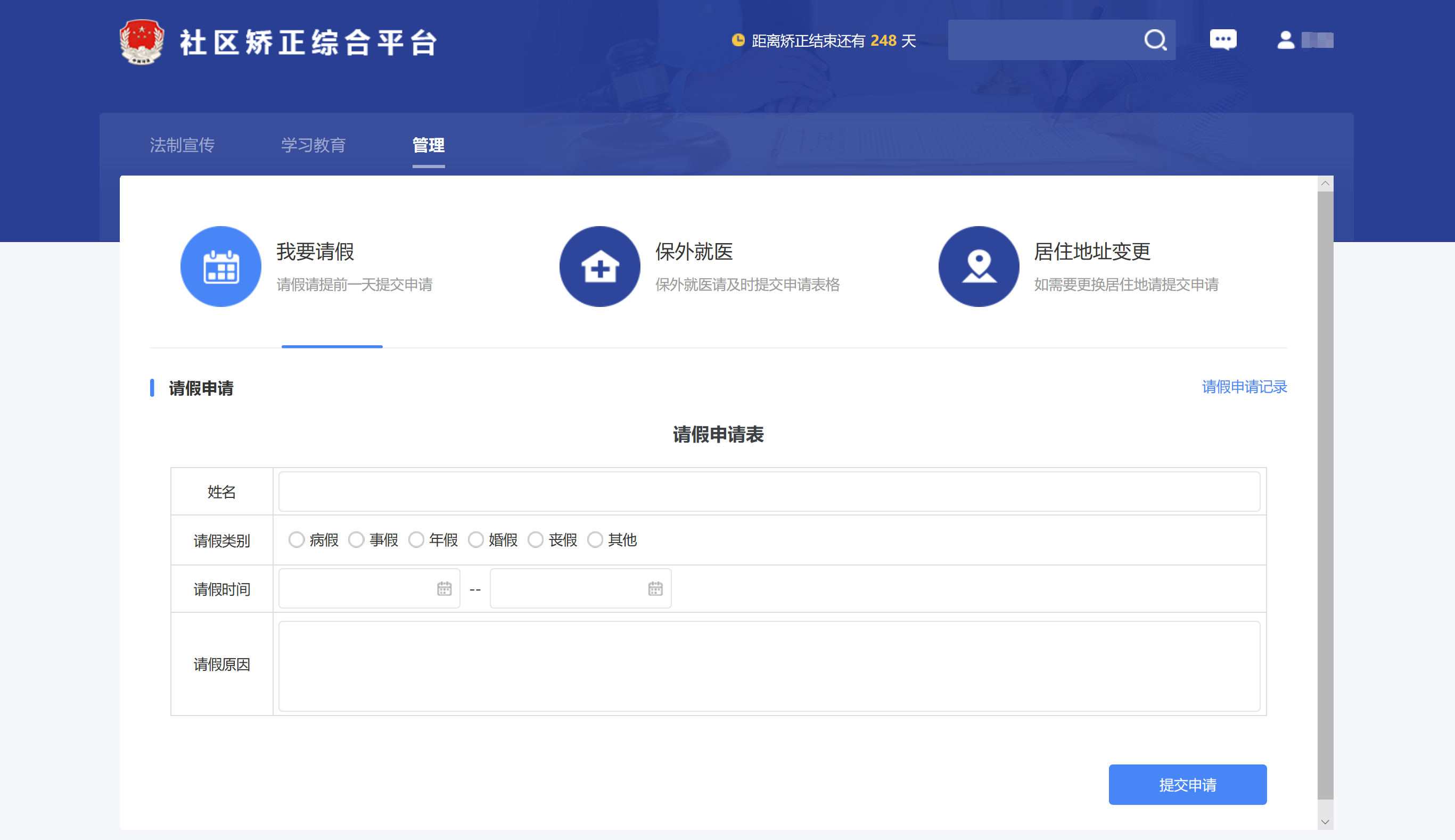 • 我要请假:矫正人员因故不能按时到场,可以申请请假。
