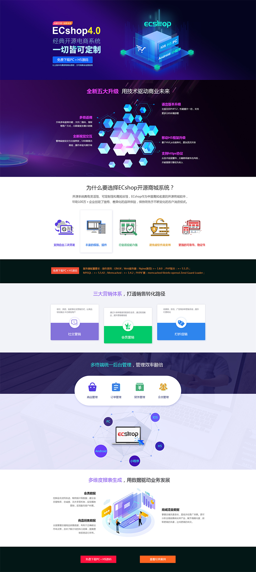 ECshop是一款B2C开源商城系统,全终端支持PC+APP+H5+小程序,适合企业及个人快速构建个性化网上商店。系统是基于PHP语言及MYSQL数据库构架开发的跨平台开源程序,最新版本为4.0.0。