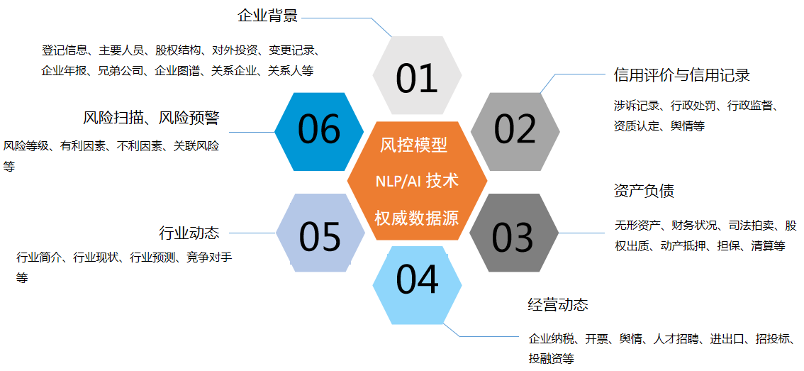 智侒信智信风控系统主要包含以下数据信息:舆情信息;企业工商信息;企业动产抵押、清算等信息;企业失信被执行、严重违法信息;企业涉诉、判决等信息;以及车辆、专利、经营、海关等信息服务。