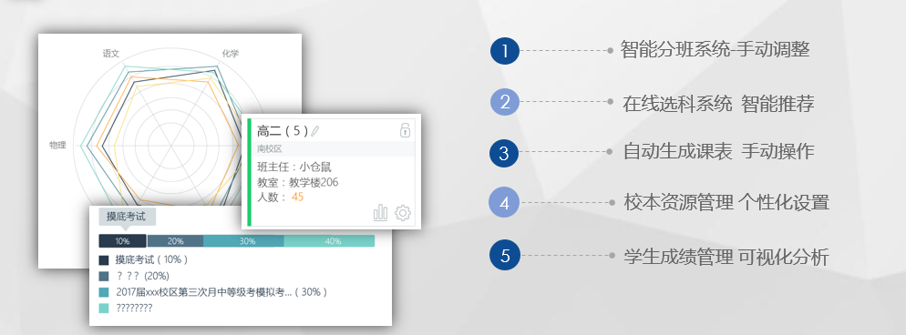 本产品主要能解决的问题有:帮助学校进行校本资源管理、帮助教务和学生完成选科事务、帮助分析学生成绩变化趋势情况等、帮助学校完成走班排课。